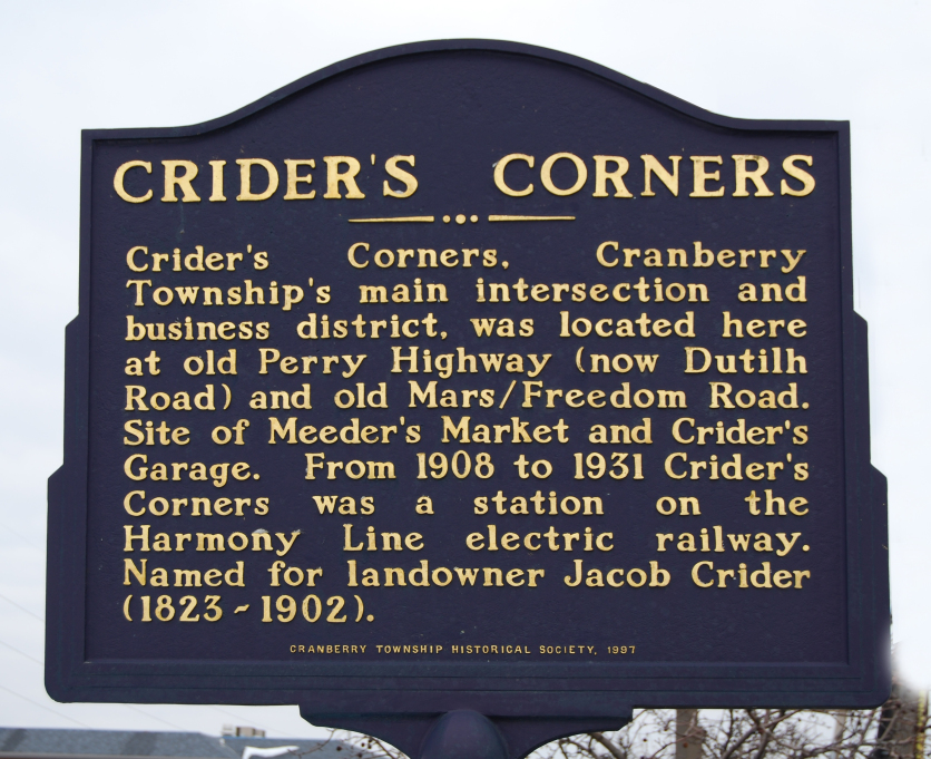 Site of Meeder's Market and Crider's Garage. From 1908 to 1931 Crider's Corners was a station on the Harmony Line electric railway. Named for landowner Jacob Crider (1823-1902).